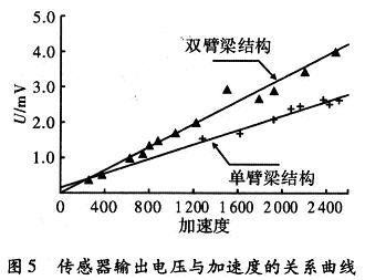 对制作的加速度传感器样品,在马希特击锤上进行了大量地冲击标定测试,测试结果表明:设计和加工制作的加速度计样品在进行加速度的冲击时,有较好的信号输出,单臂梁结构的加速度计的灵敏度为1 μV/gn;双臂梁结构的加速度计的灵敏度为1.6μV/gn,与理论设计值基本吻合。