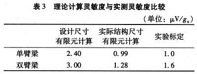 对于悬臂梁结构的硅微型加速度传感器,在其它结构尺寸相同的情况下,梁的厚度对加速度传感器的灵敏度影响最大,基本上是反比的关系。这是由于在同样的载荷下,梁厚与应力大小成反比,而应力大小直接影响灵敏度,应力越大灵敏度越高。由于加工出芯片梁的厚度比设计值偏差较大,故其测试灵敏度比设计值小,如表3所示。